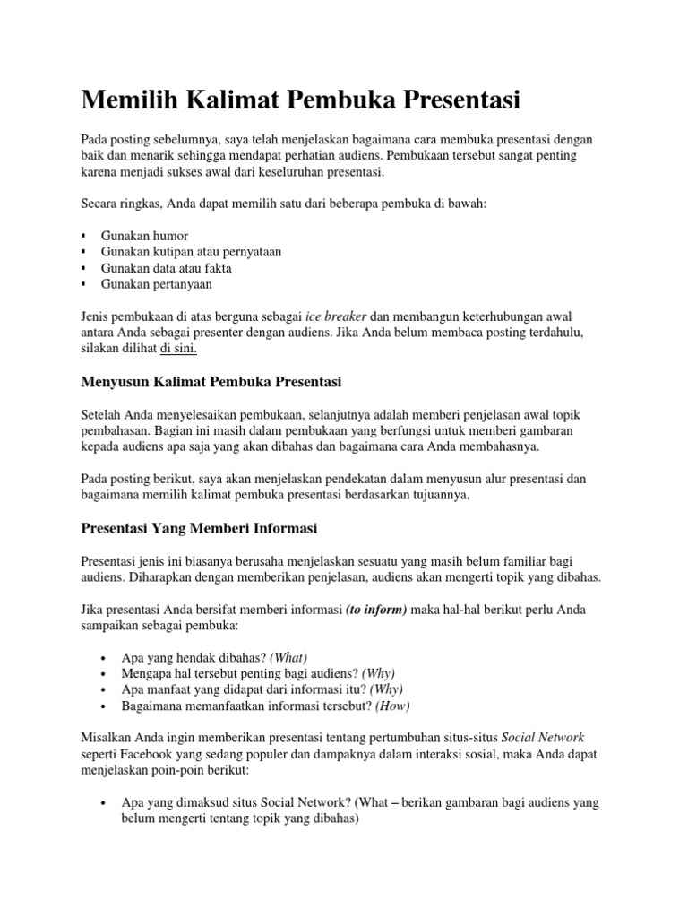 Kata pembuka presentasi. Ada beberapa cara membuka presentasi yang bisa anda gunakan dalam gunakan. Sejak itu saya belajar untuk praktek cerita humor terlebih dahulu sebelum presentasi di hadapan banya orang minimal Anda ceritakan terlebih dahulu pada pasangan Anda. A Introducing yourself Memperkenalkan diri.