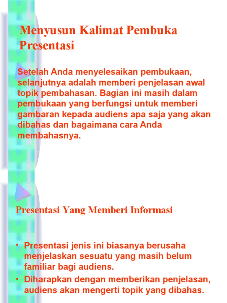 Secara umum Anda bisa menggunakan beberapa kalimat umum yang biasa dipakai banyak orang ketika membuka suatu acara presentasi. Kata-Kata Pembuka Presentasi Dalam Bahasa Inggris. Usahakan untuk menyajikan presentasi anda dengan cara yang interaktif dan menarik.