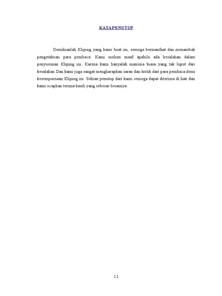 Tidak lupa saya ucapkan kepada dosen pembimbing dan teman-teman yang telah memberikan dukungan dalam menyelesaikan kliping ini. Tujuan penyusunan kliping ini yaitu untuk memenuhi salah satu syarat tugas mata pelajaran Pendidikan Kewarganegaraan PKN. Selain dari itu kami akan memberika sedikit contoh kata penutup kepada teman-teman semua.