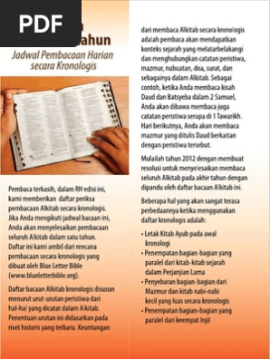 Jika anda disiplin secara teratur mengikuti panduan bahan ini maka dalam waktu satu tahun anda akan selesai membaca seluruh Alkitab sesuai dengan urutan peristiwa yang ditulis dalam Alkitab. Bacaan Setahun Berita Hari Ini Slide show. Audio Bacaan Alkitab Setahun Jumat 5 Februari 2021- Imamat 19 sd 21.