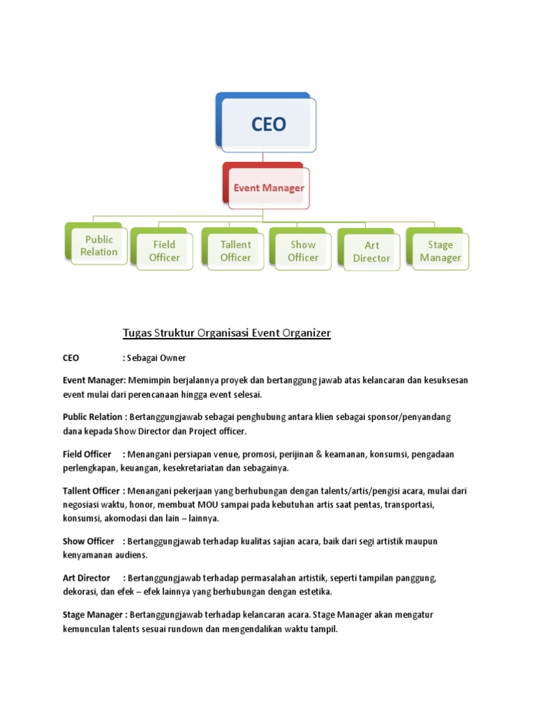 Event OrganizerEO adalah sebuah bisnis yang menawarkan jasa penyelenggaraan suatu kegiatanpameran perlombaan festival konser musik pesta perkawinan pesta ulang tahun dan lain-lain. Job Description 1. Tugas struktur organisasi event organizer ceo.