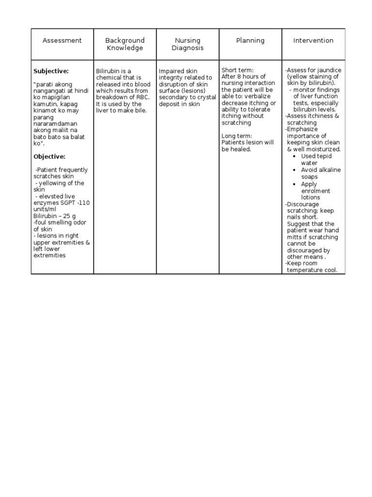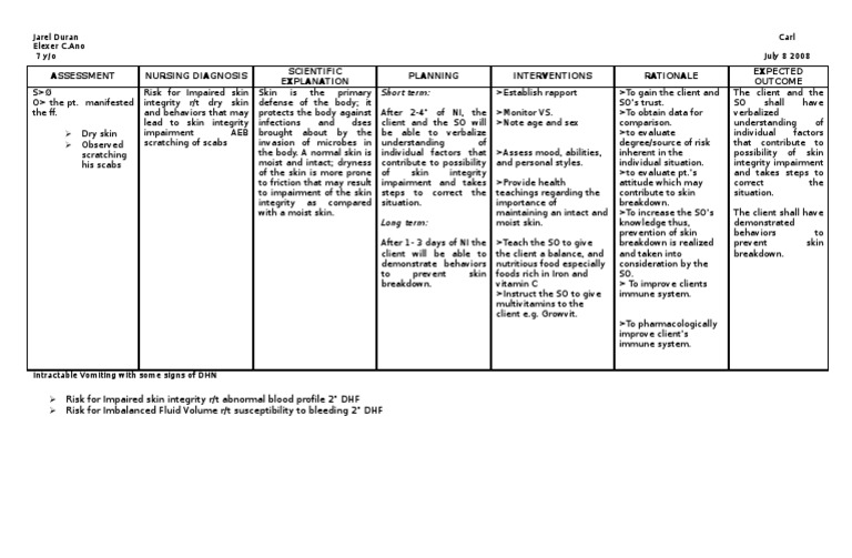Intact skin protects the patient from chemical and mechanical injury. Assessment of the condition of the skin provides baseline data for possible interventions for the nursing diagnosis risk for impaired skin integrity. Demonstrates understanding of plan to heal note: The nursing diagnosis of impaired skin integrity is a general term referring to a variety of states where the skin is altered: * pressure ulcer prevention * skin surveillance. Healthy skin varies from individual to 2. Rashes, erythema etiologies for actual impairment of skin integrity have been divided into external (environmental) and internal (somatic) etiologies. Nursing diagnosis impaired skin integrity. Table 1 lists the etiologies. · reddish stoma with reddish surrounding skin. On nursing interventions rationale for each nursing intervention 1. A nurse care plan for impaired tissue skin integrity completes with therapeutic interventions to assist in healing. Risk factors may include altered circulation and metabolic state accumulation of bile salts in skin poor skin turgor, skeletal prominence, presence of edema, ascites.