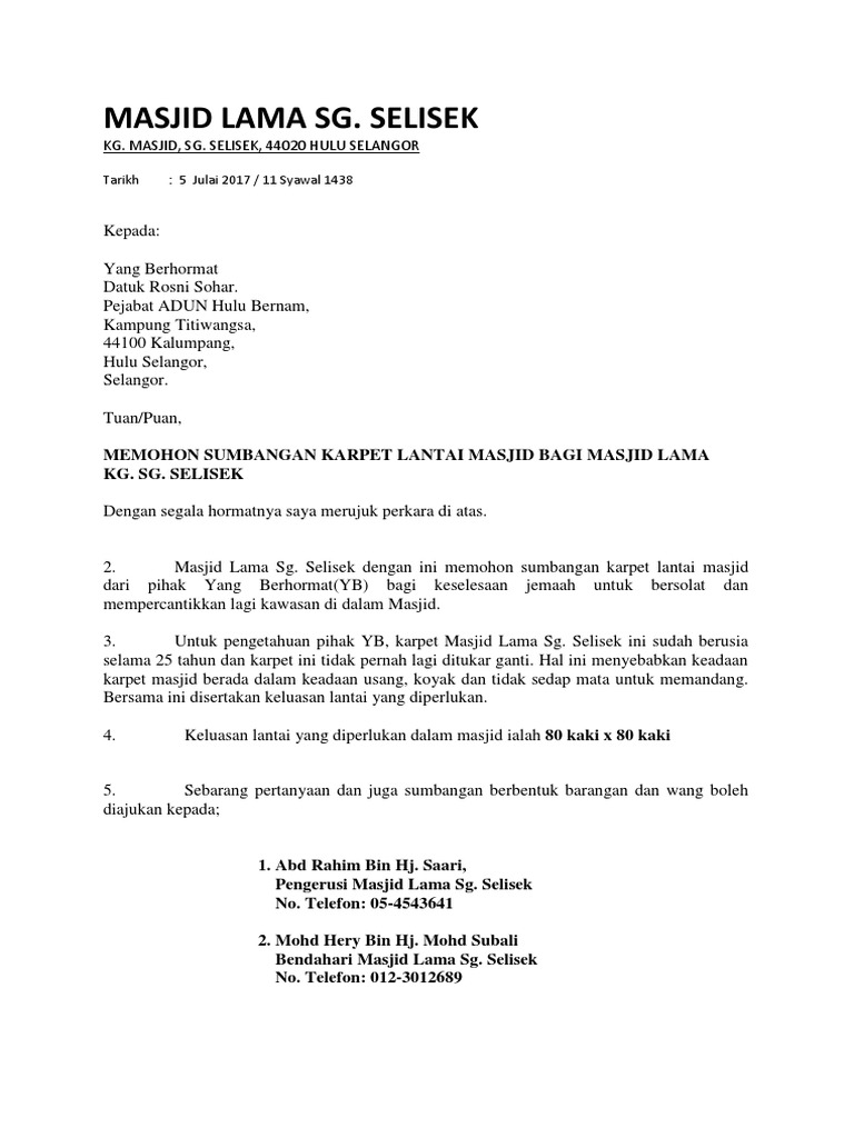 0812 9888 8165 contoh surat permohonan bantuan karpet masjid. Usaha yang halal dan tidak mengikat. Penutup Demikianlah proposal program pengadaan karpet Masjid sebagai salah satu bentuk program kerja Dewan Kemakmuran Masjid.